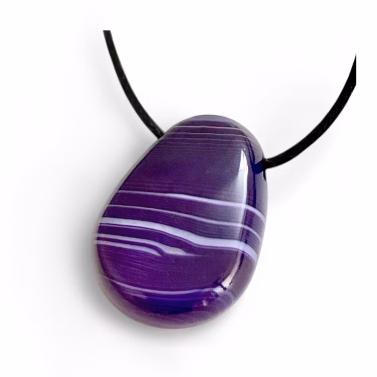Ett hängsmycke i lila agat, en vacker bandad sten med mjuka till djupare toner av lila som ger den ett lugnt och uttrycksfullt utseende. Denna variant är färgad, vilket är en vanlig behandling av agat för att förstärka färgen och framhäva stenens naturliga mönster och skiftningar på ett tydligt och dekorativt sätt.