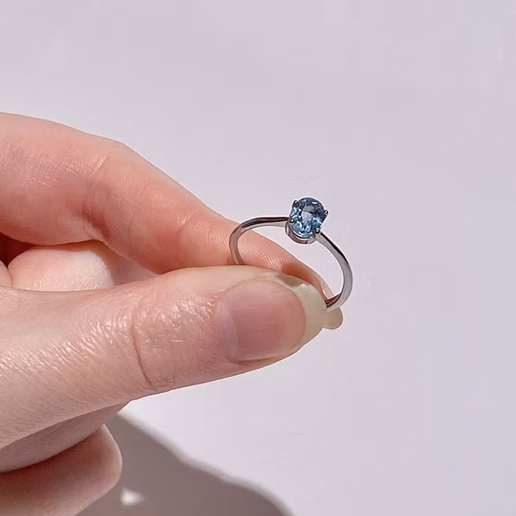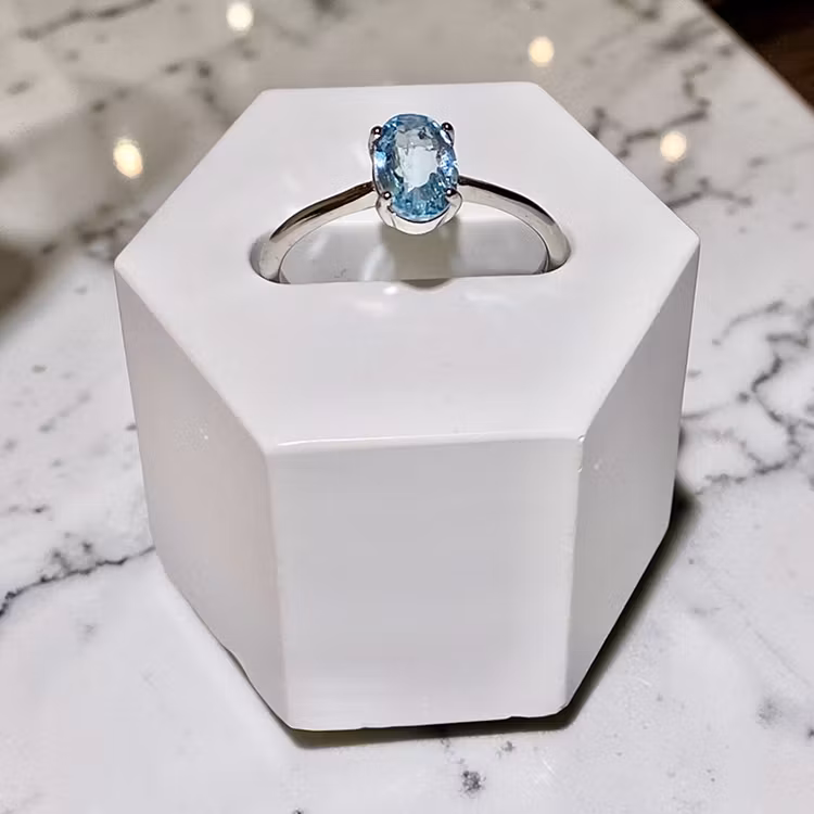 En elegant ring med en gnistrande blå topas som fångar ljuset i varje vinkel. Den blå nyansen symboliserar lugn, klarhet och sanning och stenen sägs stärka kommunikation, självuttryck och inre harmoni.