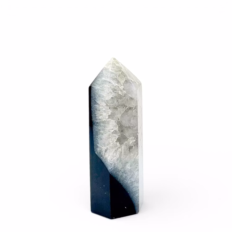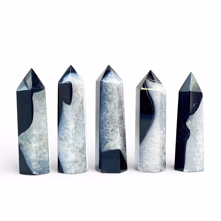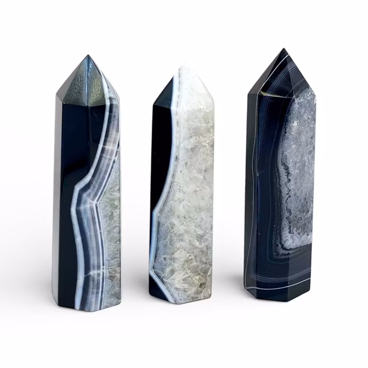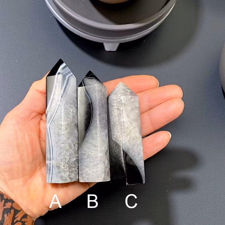 Varje svart sardonyxspets är unik i sitt mönster och sin energi, vilket gör varje kristall personlig och levande i sitt uttryck.